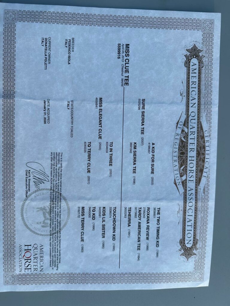 Miss Clue Tee è una fattrice Quarter Horse dal temperamento deciso e dal portamento raffinato, espressione autentica di una linea genetica solida e performante.